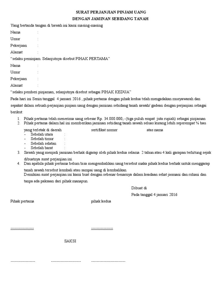 Contoh surat perjanjian sewa pajak tanah sawah . Berikut ini akan kami berikan contoh surat perjanjian gadai :. Ingin menggadaikan tanah ke orang lain di luar lembaga keuangan resmi? Dengan adanya kesepakatan antara pemberi pinjaman dan peminjam maka di buat surat perjanjian. Simak dulu contoh surat gadai tanah yang benar di artikel ini. Seperti motor yang dijadikan jaminan untuk meminjam uang dengan sistem gadai. Surat perjanjiaan gadai tanah pada hari ini, selasa tanggal 09 april 2013 di dusun jalupang rt 02/01 desa rancabango kec. Bahwa kedua belah pihak telah bersepakat bahwa perjanjian gadai tanah antara pihak pertama dan pihak kedua ini berlaku sejak tanggal penandatanganan surat . Contoh surat perjanjian gadai tanah. Jika ya, pasti anda membutuhkan surat perjanjian jika ingin menggadaikan tanah tersebut. Ada beberapa asset yang sangat sering dijadikan jaminan seperti motor, mobil, tanah, sawah, rumah, kontrakan, . Search surat perjanjian sewa apartemen slideusorg. Contoh surat perjanjian gadai tanah.